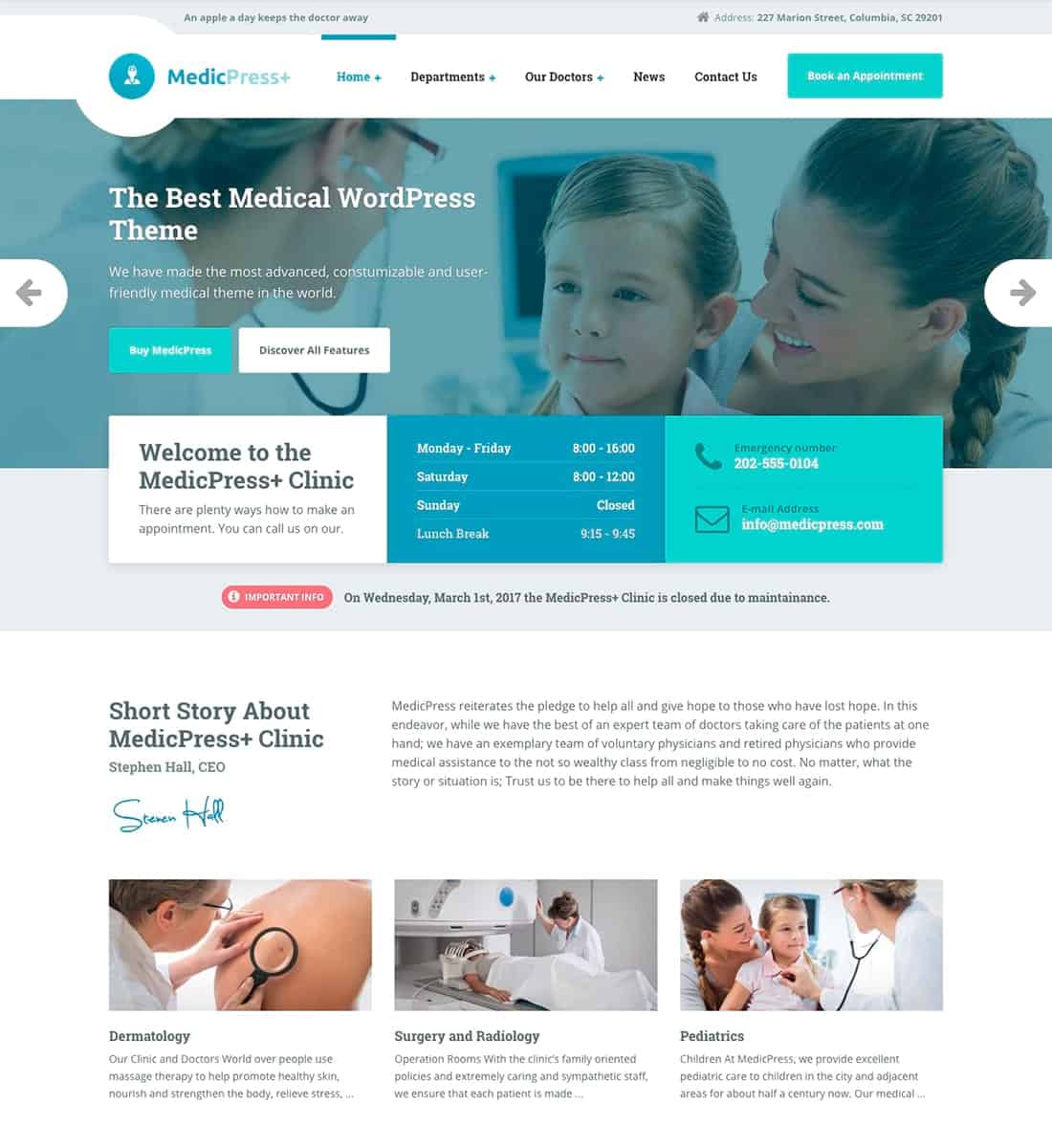 MedicPress is one of the latest themes from ProteusThemes. Yes, this is our own theme, but that doesn’t mean we were lenient, when we were comparing the theme with others. As you can see on the screenshot, MedicPress has plenty of space, where you can show your most important information, e.g. opening hours and contact information. An option for adding notices is also a nice touch, in case there is some urgent news at your clinic. With this theme, your patients will be well informed and only one click away from the appointment.